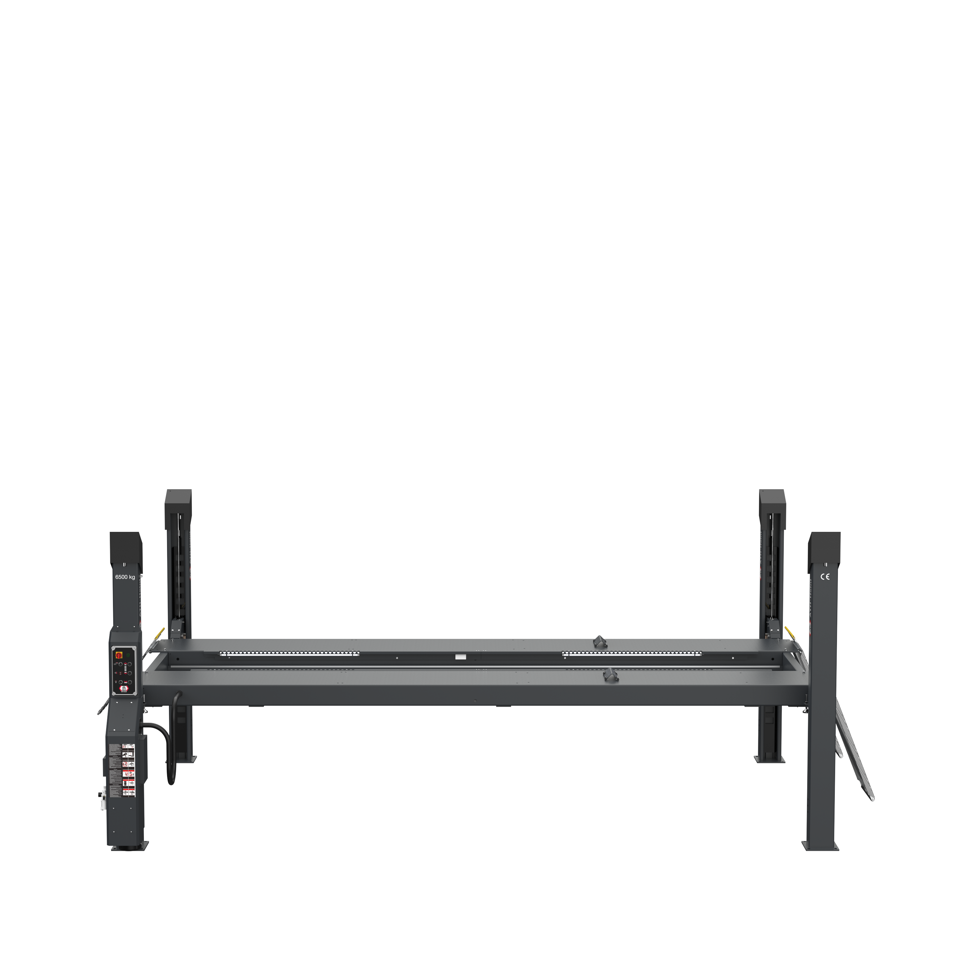 - Elektrohydraulische 4-Säulen-Hebebühne mit Schnellhub-Aggregat und lastabhängiger Senkfunktion